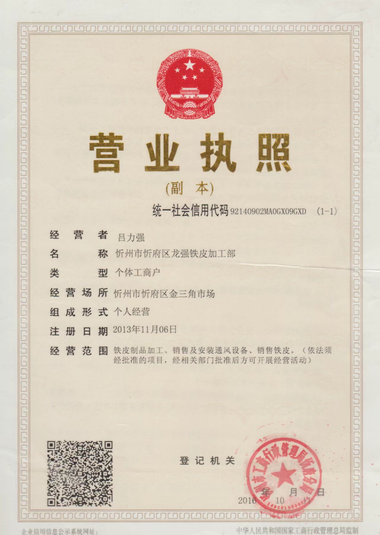 忻州市忻府区龙强铁皮加工部是由吕力强(从业20余年)创办,加工厂拥有先进的白铁皮共板法兰加工机器,有10多年的行业经验和稳定的施工团队。龙强铁皮通风管道设备加工厂是专业设计安装白铁皮通风管道,共板法兰风管,宾馆,酒店,地下室,中央空调风管通风排烟以及油烟进化业务。近年来,通过不断的发展,规模不断扩大,并与忻州好多知名企业建立了合作关系。